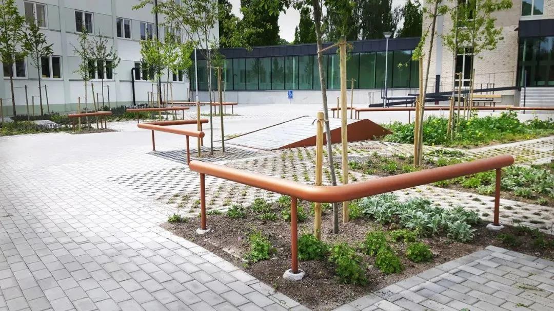 在軟硬鋪裝結合的基礎上,植物區與純鋪裝的阻攔部分采用銅色管狀阻隔物。銅色是溫暖的顏色,有利于