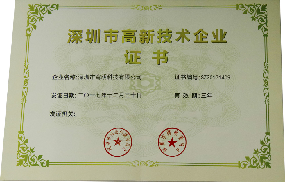 依據《深圳市高新技術企業認定管理辦法》的規定,深圳市科工貿信委、市財政委組織專家,經過層層嚴格的審查,我司憑借優秀的研發實力和創新能力,通過深圳市高新技術企業認證。