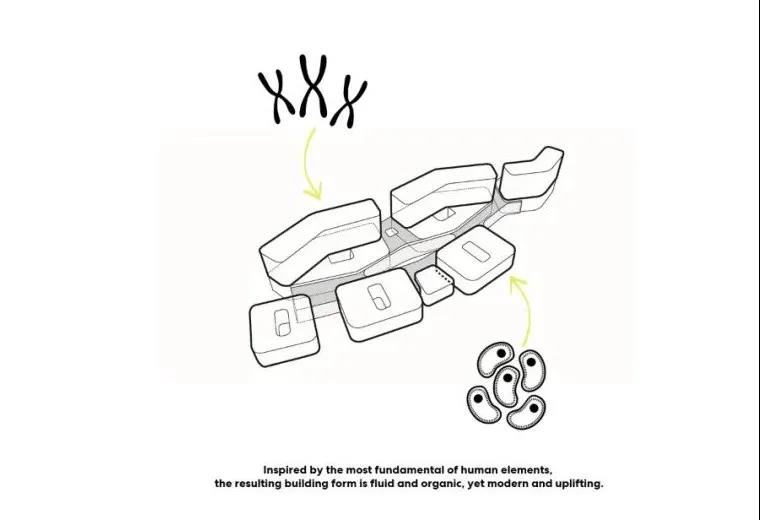 建筑的設(shè)計理念源自大自然最基本的生命元素——細(xì)胞。南側(cè)門診樓和行政樓被賦予細(xì)胞狀的外觀;北側(cè)建筑體塊的排布則模擬了細(xì)胞內(nèi)染色體的形態(tài)。建筑的朝向和角度與河道景觀交相呼應(yīng),呈現(xiàn)出律動的美感。